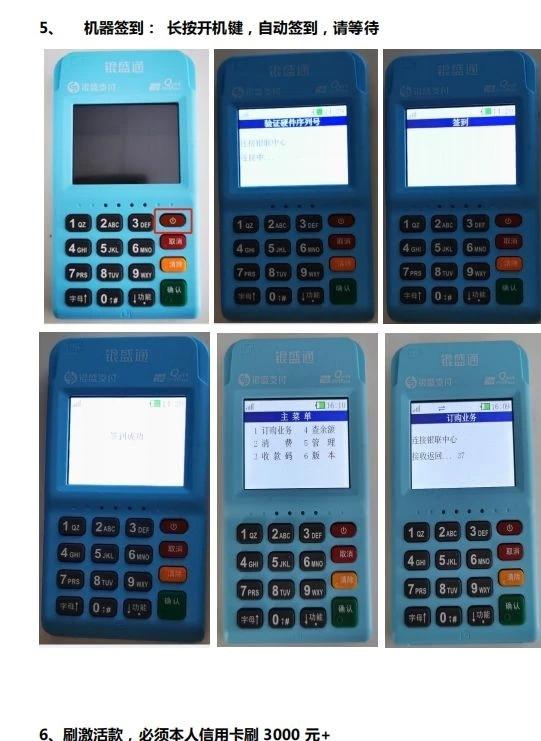 6機器激活操作流程:機器按紅色按鍵開機會自動更新參數后,簽到01 密碼0000 →主頁面選1訂購業務→輸入金額(商戶首次用本人信用卡刷卡≥3000元視為激活)→輸入密碼,刷卡(每一張卡首次交易都需要插卡/刷卡后才可以進行閃付)