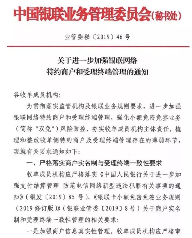 今日起,關閉所有大pos平臺的小額雙免交易,真實執照進件的商戶不受影響。如用戶在我司傳統POS終端使用云閃付小額雙免時提示:響應碼40 ,請讓商戶進行刷卡或插卡交易。此前,銀聯曾發布《關于進一步加強銀聯網絡特約商戶和受理終端管理的通知》,要求收單成員機構應嚴格審核商戶資料,采取有效措施核實商戶經營真實性與合法性。按照“應注冊、盡注冊”原則,在銀聯商戶平臺準確填報相關商戶信息,做好注冊登記工作。收單成員機構應落實《關于加強小額免密免簽商戶注冊登記的通知》要求,對小額雙免商戶注冊登記情況進行排查,并按計劃進行補注冊工作。 《通知》稱10月下旬左右啟用雙免交易白名單核驗功能。重申為了防范網上買賣POS機、刷卡器等受理終端,加強外包機構管理,嚴禁外包機構利用網絡渠道售賣受理終端。
